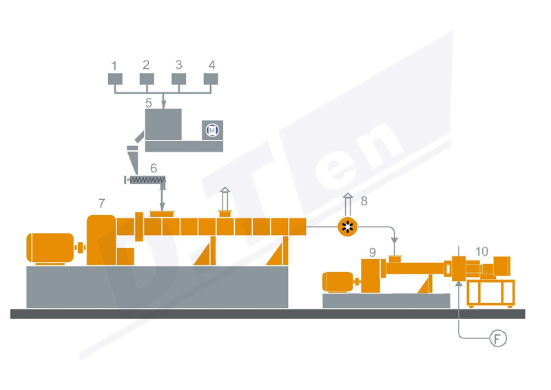 PVC電纜料 1. PVC粉 2. 色粉 3. 增塑劑 4. 填充 5. 高速混合機(jī) 6. 體積式喂料機(jī) 7. 雙螺桿擠出機(jī) 8. 強(qiáng)制真空排氣 9. 單螺桿擠出機(jī) 10. 風(fēng)冷模面熱切 |