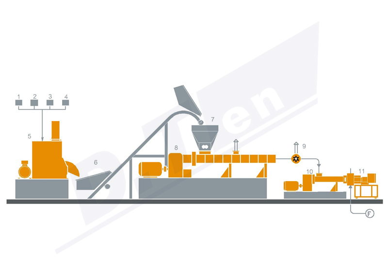 低煙無鹵電纜料 1. PE顆粒 2. EVA顆粒 3. ATH(氫氧化鋁、氫氧化鎂) 4. 助劑 5. 密煉機(jī) 6. 提升機(jī) 7. 錐雙喂料機(jī) 8. 雙螺桿擠出機(jī) 9. 強(qiáng)制真空排氣 10. 單螺桿擠出機(jī) 11. 風(fēng)冷模面熱切